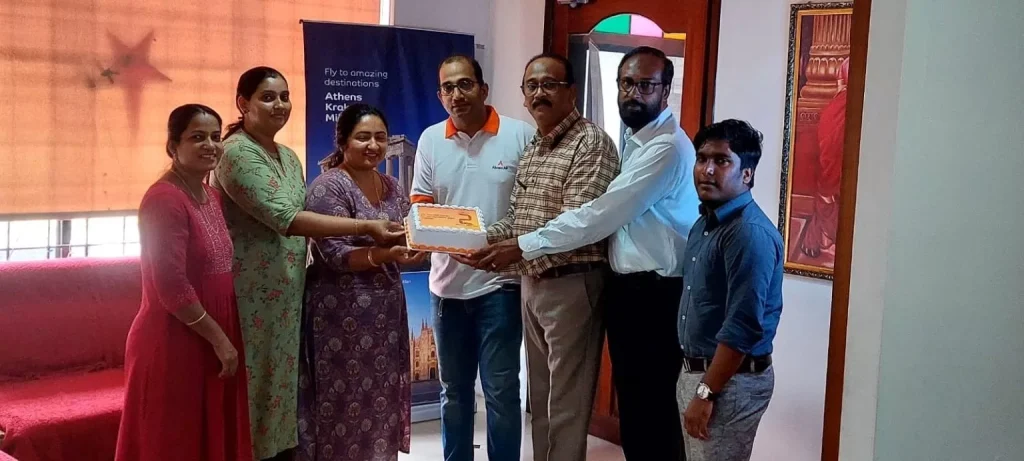 Mr. Sudheesh Mangalasseri, the Manager for Kerala & Tamil Nadu at Akasa Air, marked a special occasion by celebrating the second anniversary of successful partnership with the management and staff of Peacock Travel & Holidays Pvt Ltd in Kochi. The event, held in the presence of Mr. Anil Srinivasan & Mr. Rajeev KR, Directors of Peacock Travel & Holidays, was a joyful occasion that highlighted the strong collaboration and shared achievements between both teams over the past two years.